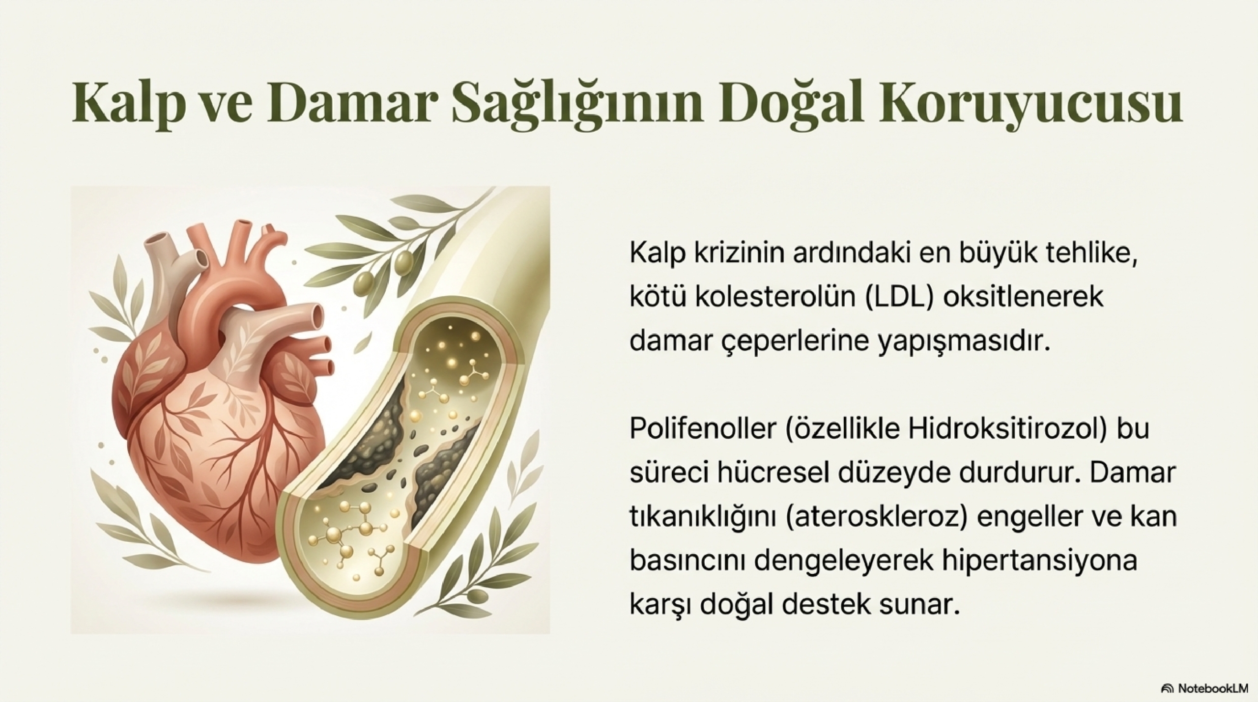 Polifenollerin en çok bilinen ve bilimsel olarak en çok desteklenen faydası kalp sağlığı üzerinedir. Özellikle hidroksitirozol, kötü kolesterol olarak bilinen LDL’nin oksitlenmesini engeller. LDL kolesterol oksitlendiğinde damar çeperlerine yapışarak damar tıkanıklığına (ateroskleroz) yol açar. Polifenoller bu süreci durdurarak kalp krizi ve inme riskini ciddi oranda azaltır. Ayrıca kan basıncını dengelemeye yardımcı olarak hipertansiyon hastaları için doğal bir destek sunar.