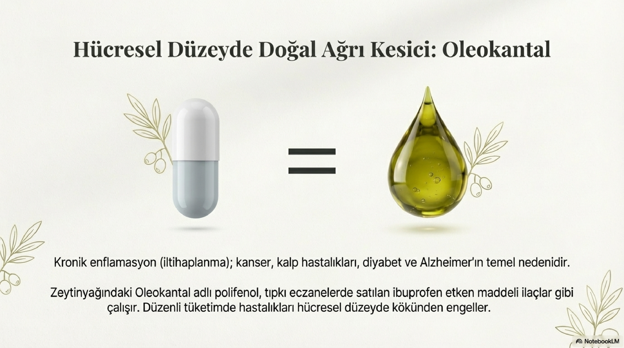Zeytinyağındaki oleokantal adlı polifenol, tıpkı eczanelerde satılan ibuprofen etken maddeli ağrı kesiciler gibi çalışır. Vücuttaki kronik enflamasyonu (iltihaplanmayı) azaltır. Kronik enflamasyon; kanser, kalp hastalıkları, metabolik sendrom, tip 2 diyabet, Alzheimer ve artrit gibi birçok ciddi hastalığın temel nedenidir. Düzenli yüksek polifenollü zeytinyağı tüketimi, bu hastalıklara yakalanma riskini hücresel düzeyde engeller.