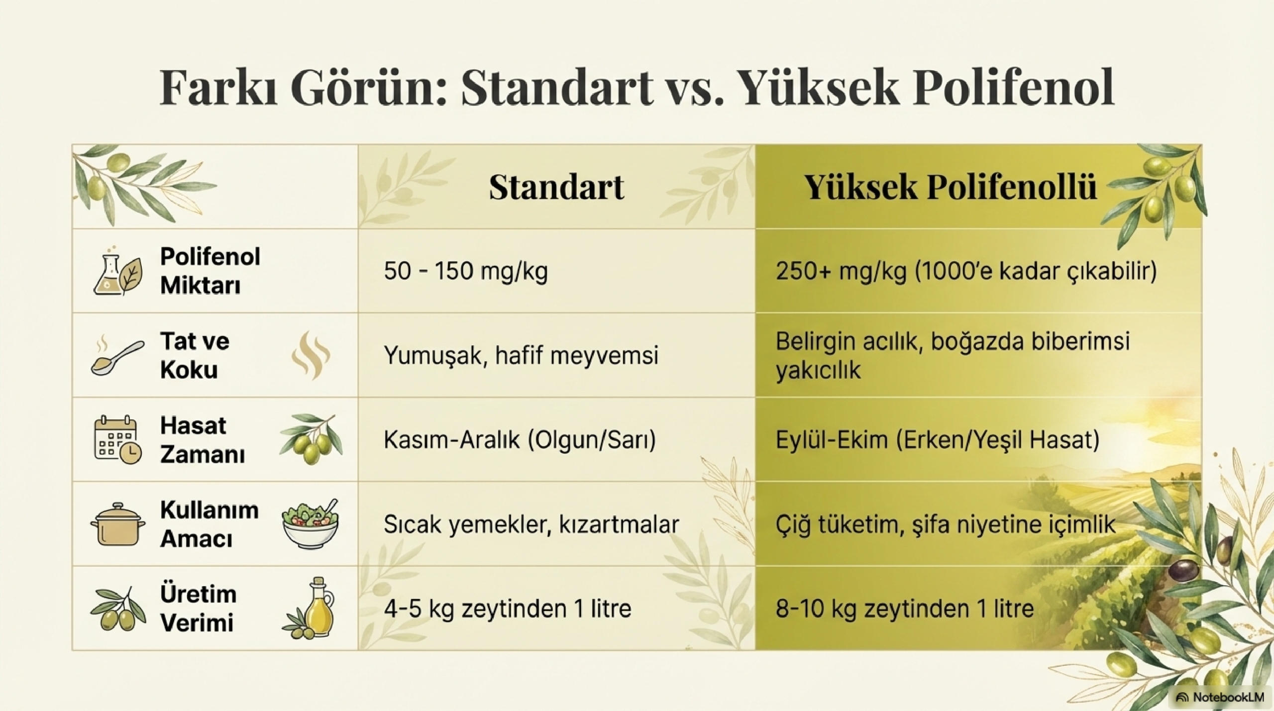 - Karşılaştırma Tablosu: Standart ve Yüksek Polifenollü Zeytinyağı