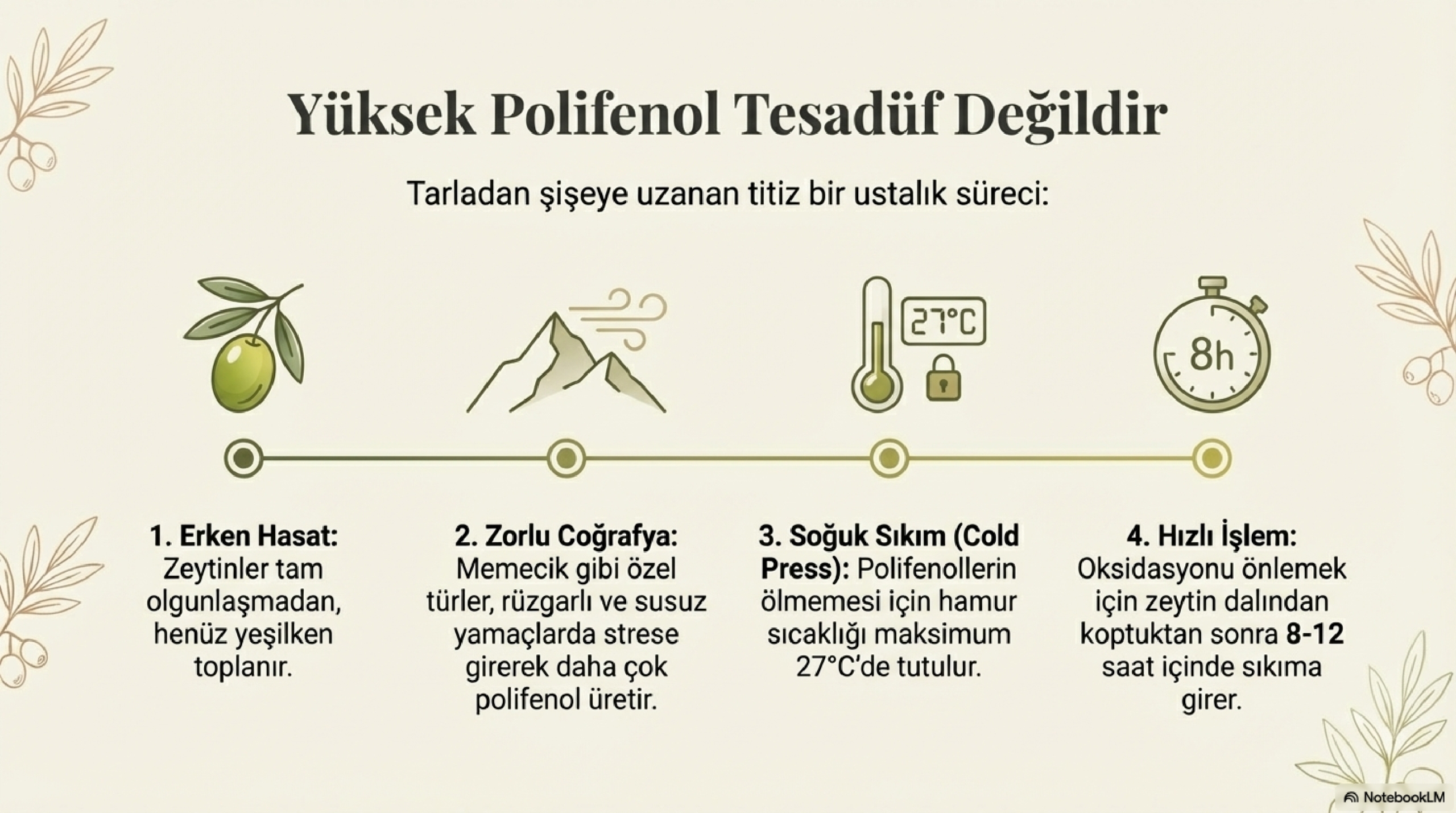 Bir zeytinyağının polifenol açısından zengin olabilmesi tesadüf değildir. Tarladan şişeye kadar uzanan zorlu ve titiz bir sürecin sonucudur. Polifenol miktarını doğrudan etkileyen unsurlar şunlardır: