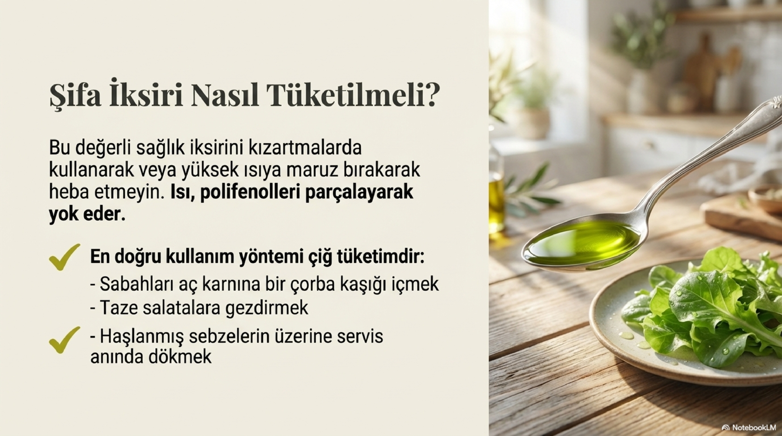 Satın aldığınız bu değerli sağlık iksirini yanlış kullanarak heba etmek istemezsiniz. Yüksek polifenollü zeytinyağları, yemek pişirmekten ziyade çiğ tüketim için uygundur. Sabahları aç karnına bir çorba kaşığı içmek, salatalara gezdirmek, haşlanmış sebzelerin üzerine dökerek tüketmek en doğru yöntemdir. Isı uygulandığında polifenollerin bir kısmı kaybolacağı için, bu yağları kızartmalarda kullanmak israf olacaktır.